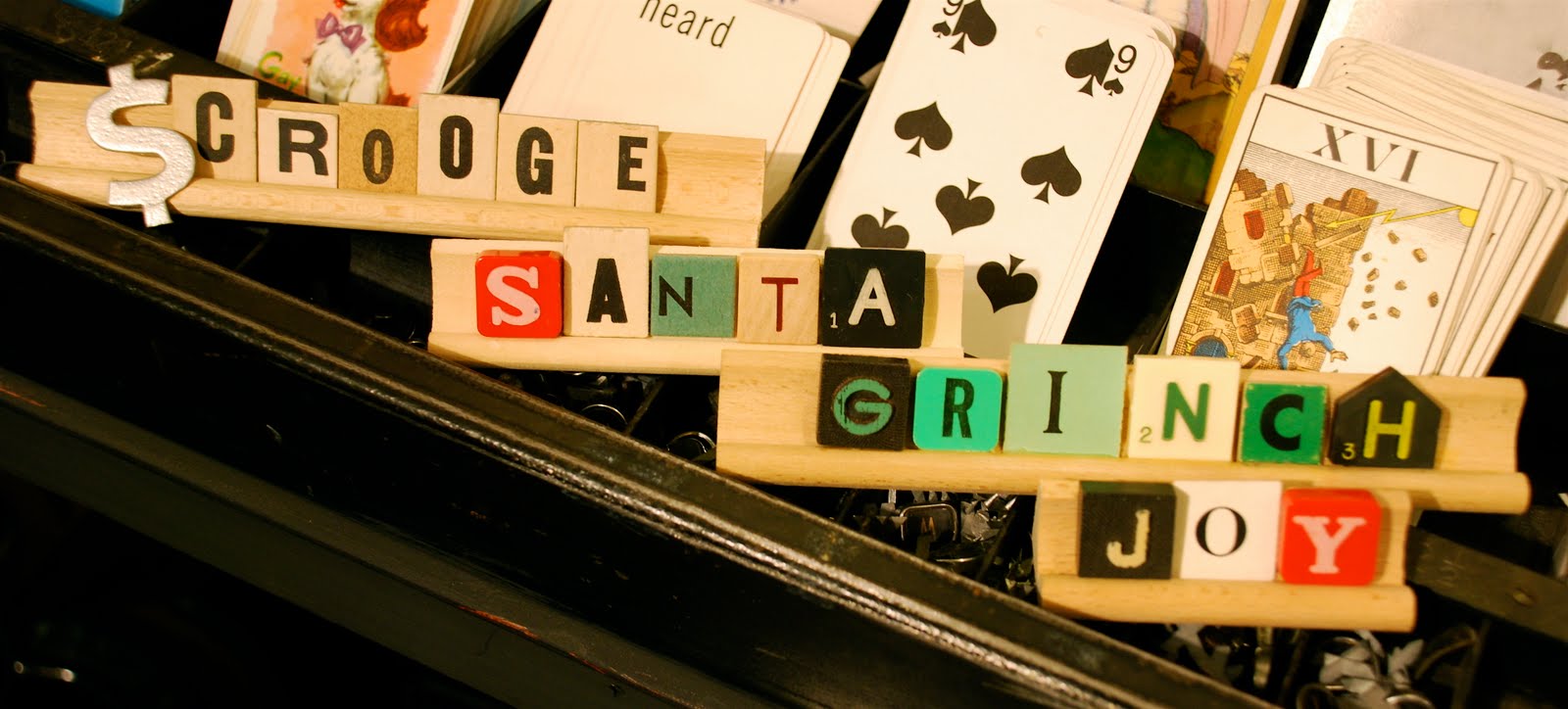 Give us Foursiders a bottle of glue and some ephemera, and we are on cloud nine! This holiday season we are busy making ornaments from letter cubes and ribbon, filling tile holders with our favorite holiday words, and glittering everything we can get our hands on. Get inspired by our ideas and craft some of your own, or stop by our Andersonville location and check out our fun festive hand-made decorations. Scrabble ornaments, $7.25-$17.25 each. Festive anagram words, $9 each.