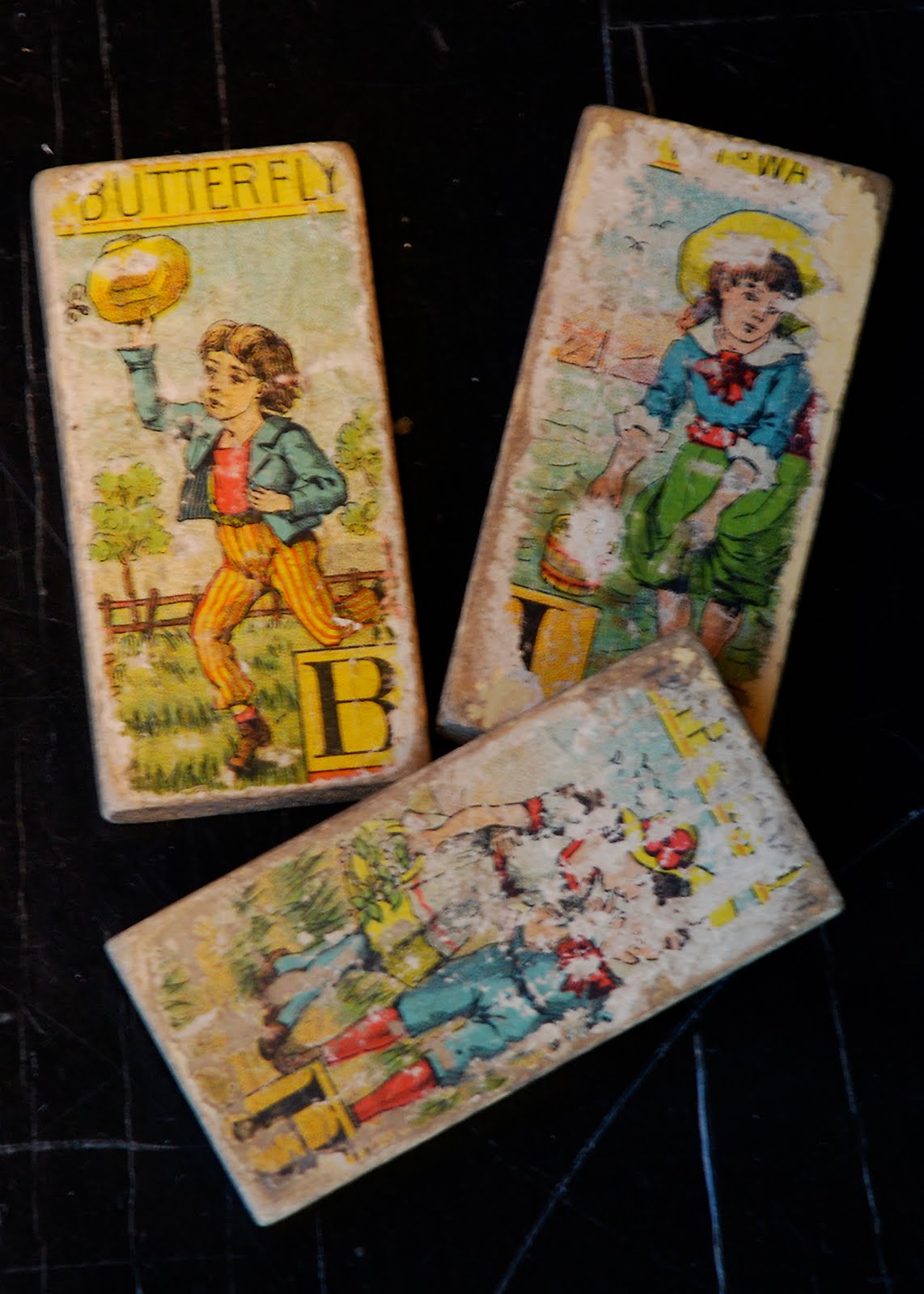 top: Victorian alphabet blocks from the late 1800's, $4.99 each.
