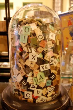 Bell Jar full of 900 anagrams, scrabble tiles, and game pieces.