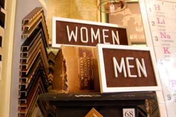 I made some Men and Women bathroom signs from some cool plastic marquee letters I had lyin' around. I mounted them on a cool espresso suede. They sit on a table or hang on a wall. And if you're really loose, you could stick one outside your door in your apartment building indicating what sex you'd like to enter. men-$24/ women-$28
